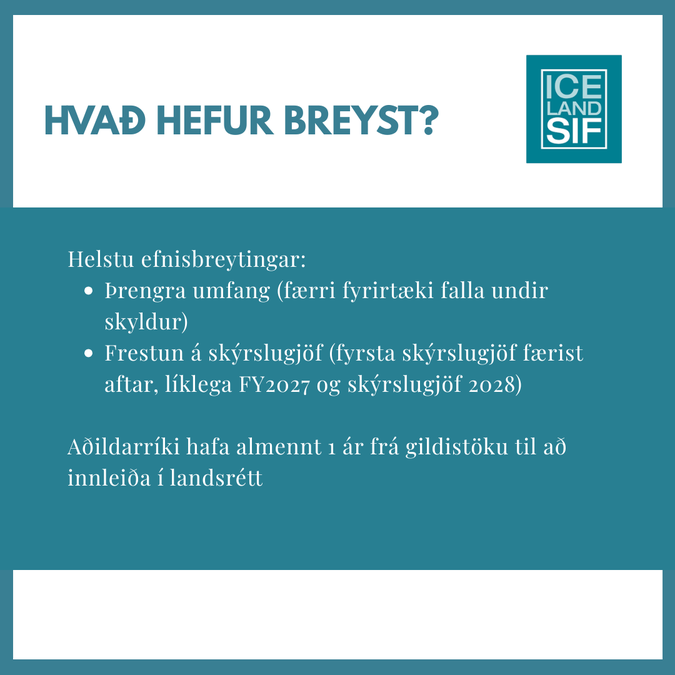 Helstu efnisbreytingar fela í sér að umfang reglugerðarinnar er þrengra en áður var lagt upp með, sem þýðir að færri fyrirtæki falla undir skýrsluskyldu. Jafnframt hefur tímalína skýrslugjafar verið frestuð, þar sem fyrstu skýrslur munu líklega færast til ársins 2027 (með birtingu 2028).