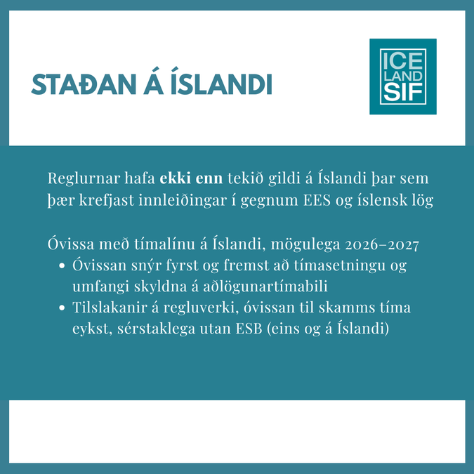 Á Íslandi hafa reglurnar enn ekki tekið gildi þar sem þær þurfa að fara í gegnum innleiðingu í gegnum EES-samninginn og íslensk lög. Óvissa er því enn til staðar um tímasetningar og útfærslu hérlendis, en líklegt er að innleiðing geti átt sér stað á árunum 2026–2027.